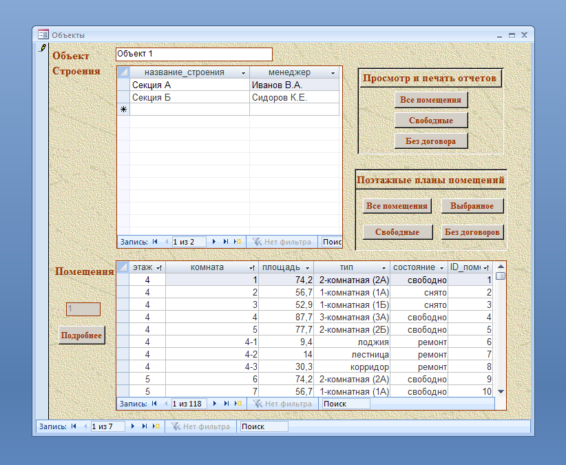 Рассмотрим для примера базу данных по аренде помещений, разработанную группой «1IRR» [2]. Главная таблица базы показана на рис. 1.