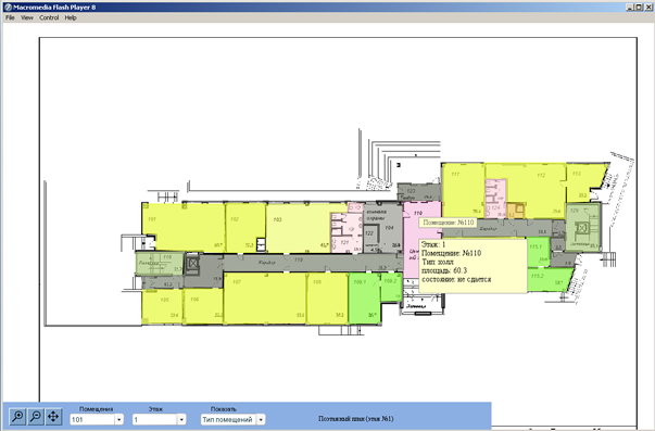 Перейдя на форму «Объекты» мы можем сформировать запросы для различных режимов визуализации помещений на поэтажном плане. Можно вывести изображения помещений, раскрасив их по типу, по наличию договора аренды, по состоянию (свободно, снято, ремонт и др.), вывести на плане одно помещение (рис. 2).